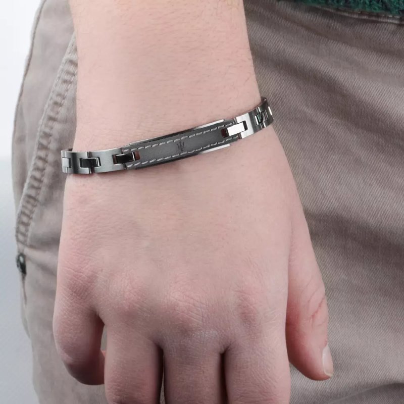 Bracciale Maserati da uomo della collezione Maserati J. Bracciale realizzato in acciaio di colore grigio satinato e cuoio grigio. La lunghezza del bracciale è di 21,5 cm. Referenza: JM218AMD02