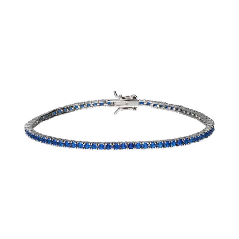 Bracciale da donna in argento 925. Bracciale modello tennis con pietre zirconi blu, dimensioni pietre 2.5 mm. La lunghezza del bracciale è di 18 cm. La chiusura del bracciale è a cassonetto con chiusura di sicurezza. Referenza: GL-SJ1009