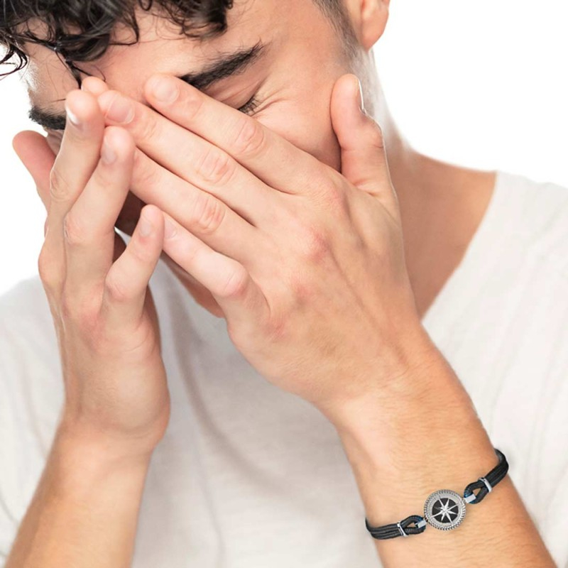 Bracciale con cordino in poliestere con centrale con rosa dei venti con smalto, al centro un cristallo bianco. Sul retro incisa la scritta "FOLLOW YOUR STAR", una rosa dei venti e il logo Marlù. Lunghezza totale 21 cm, regolabile da 21 a 19,5 cm tramite chiusura a scatto removibile. Referenza: 30BR0024-N