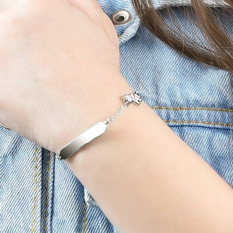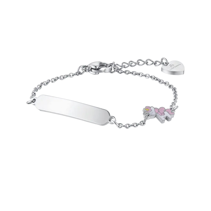 Bracciale in acciaio con unicorno. Lunghezza: 14 + 2 cm. Referenza: JB120