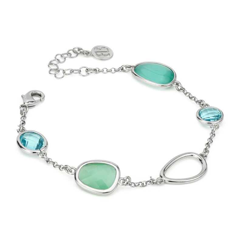 Bracciale da donna Boccadamo della collezione Crisette. Bracciale in bronzo con cristalli di colore azzurro e verde, lunghezza regolabile da 18 a 21,5 cm. Chiusura con moschettone. Referenza: XB1045