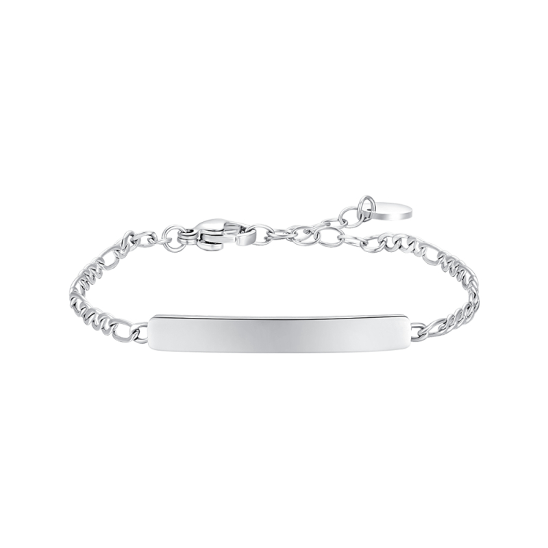 Bracciale bambino in acciaio con piastra personalizzabile con incisione. Lunghezza: 14 + 2 cm. Misura piastra: 30 x 4 mm. Referenza: JB264