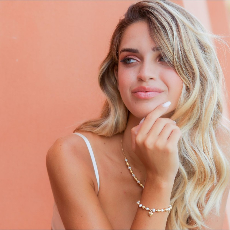 Bracciale da donna Marcello Pane della collezione Mon Amour Bonton. Bracciale in argento 925 PVD oro con perle bianche e pendente a forma di cuore, lunghezza regolabile da 17 a 20 cm. Referenza: BRML 019