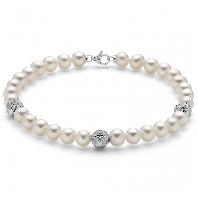Bracciale da donna Miluna della collezione Perle Boule e Fantasia. Bracciale con perle coltivate diametro 5/5.5 e 5.5/6 mm e 3 elementi in oro bianco 750/00 (18 kt). La chiusura è in oro bianco 750/00 (18 kt). La lunghezza del bracciale è di 18 cm. Referenza: PBR2765V