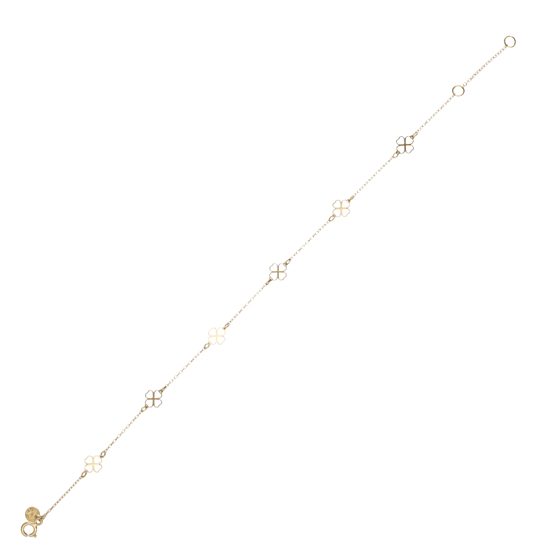 Bracciale da donna in oro giallo 750 (18 KT). Bracciale a catena con quadrifogli. Lunghezza regolabile da 17 a 19 cm, chiusura con moschettone. Il peso del bracciale è di 0,70 grammi. Referenza: GL102392