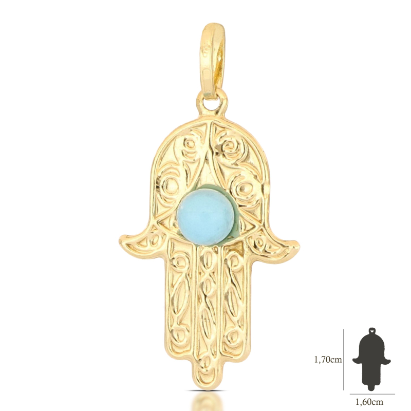 Ciondolo unisex a forma di mano di Fatima in oro giallo 750/00 (18kt), pietra turchese, lavorazione lucida, dimensioni 1,70 x 2,50 cm, peso 1.20 grammi. Referenza: 803321713686