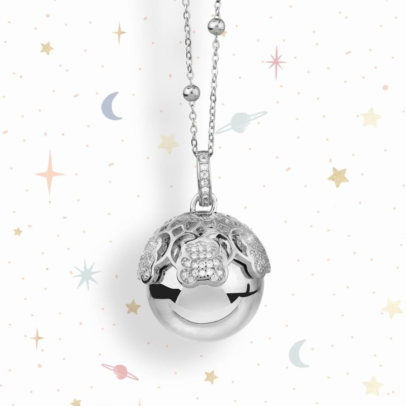 La collana per la neomamma è inserita all'interno di una confezione dedicata che contiene anche un tenero peluche-copertina per il neonato.