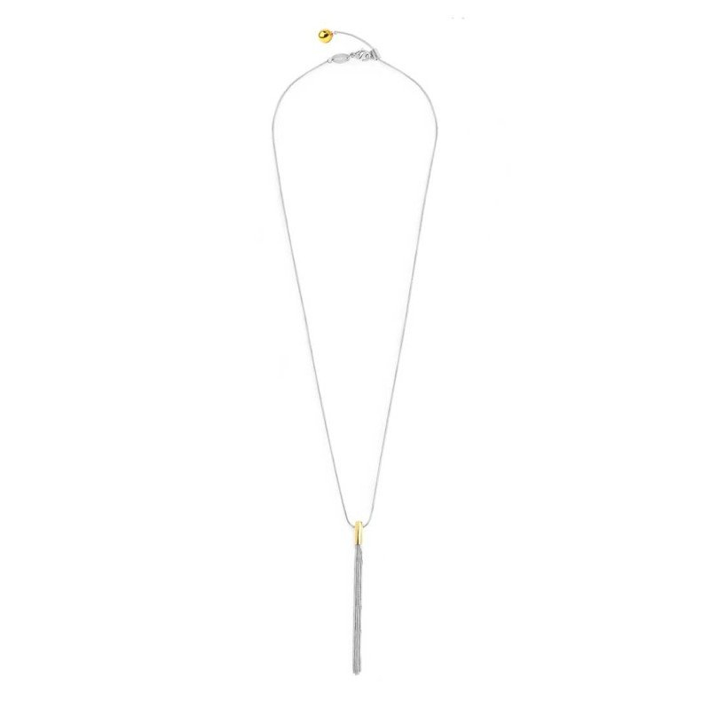 Collana in acciaio e pvd oro con centrale pendente multifilo con misura 7,5 cm. Su una estremità sfera intercambiabile in acciaio pvd oro con diametro 8 mm. Lunghezza totale 60 cm regolabile tramite cursore. Referenza: 33CO0035GS