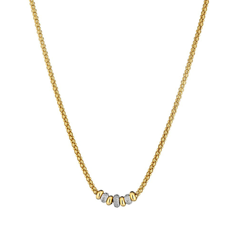 La Collana Dischi Lux – Twist unisce riflessi dorati e tocchi di luce chiara in un equilibrio elegante, posandosi delicatamente sul collo per illuminare ogni look.