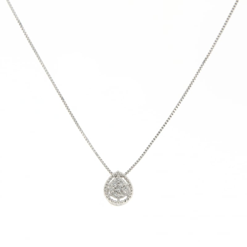 Collana da donna Promesse Gioielli in oro bianco 750/00 (18kt). Collana con pendente a forma di goccia con pavè di diamanti, 0.04 carati totali, colore G/H, purezza VS1. La lunghezza della collana è di 45 cm. La chiusura della collana è con moschettone. Referenza: CPGOCC