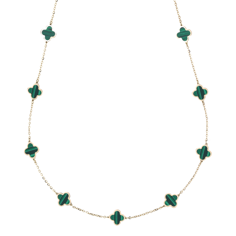 Collana da donna in oro giallo 750 (18 kt). Collana a catena con quadrifogli in malachite, dimensione quadrifogli 0,70 x 0,70 cm. La lunghezza della collana è regolabile da 42 a 45 cm, chiusura con moschettone. Il peso della collana è di 3,10 grammi. Referenza: GL102317