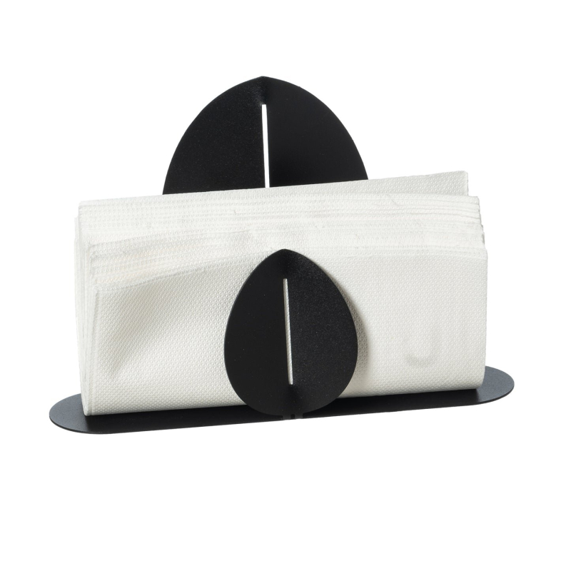 Un portatovaglioli con il design che, come tutti quelli della linea "Ficus", richiama la foglia di fico. Una più grande (quella posteriore), l'altra più piccola (quella anteriore), entrambe servono per sostenere i tovaglioli al loro interno.
