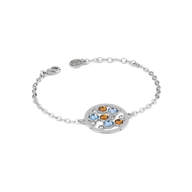 Boccadamo Damenarmband aus der Harem-Kollektion. Bronzearmband mit Kreisverzierung aus Kristall-, Aquamarin- und Topaskristallen, verstellbare Länge von 16 bis 19,5 cm. Referenz: XB1019