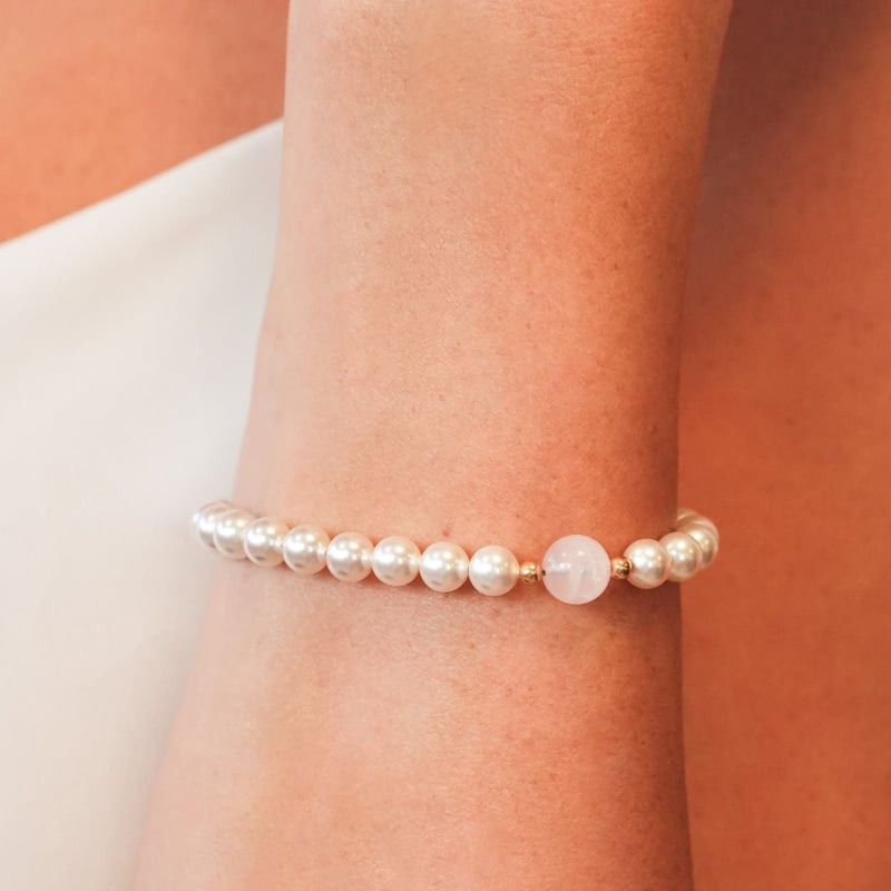 Bottega Boccadamo Damenarmband aus der Perla-Kollektion. Armband aus 925er Silber mit PVD-Goldbeschichtung, verziert mit einer Kette aus mittelgroßen Perlen, Kugeln und einem zentralen Rosenquarz. Verstellbare Länge von 17,5 bis 20,5 cm. Referenz: BBR142DR