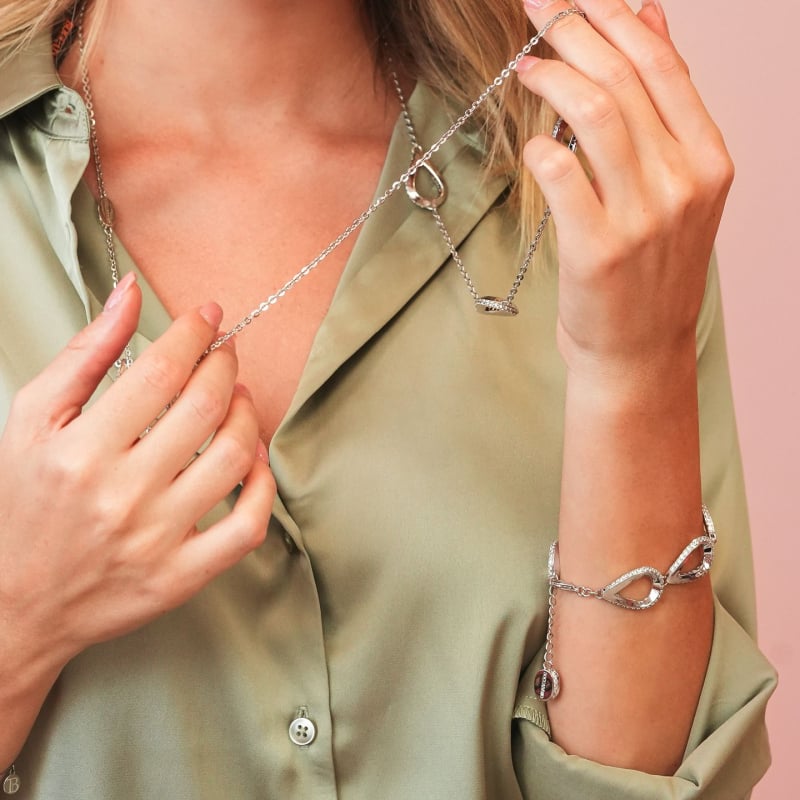 Boccadamo Damenarmband aus der Caleida-Kollektion. Tropfenförmiges Kettenarmband aus Bronze mit Zirkoniasteinen, verstellbare Länge von 17,50 bis 21 cm. Karabinerverschluss. Referenz: KBR035