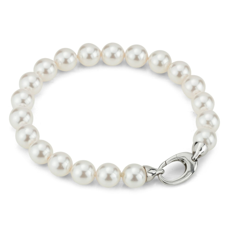 Damenarmband von Bottega Boccadamo aus der Perla-Kollektion. Armband aus 925er Sterlingsilber mit einer Perlenreihe und ovalem Karabinerverschluss. Perlendurchmesser: 8 mm, Armbandlänge: 20 cm. Referenz: BBR139M