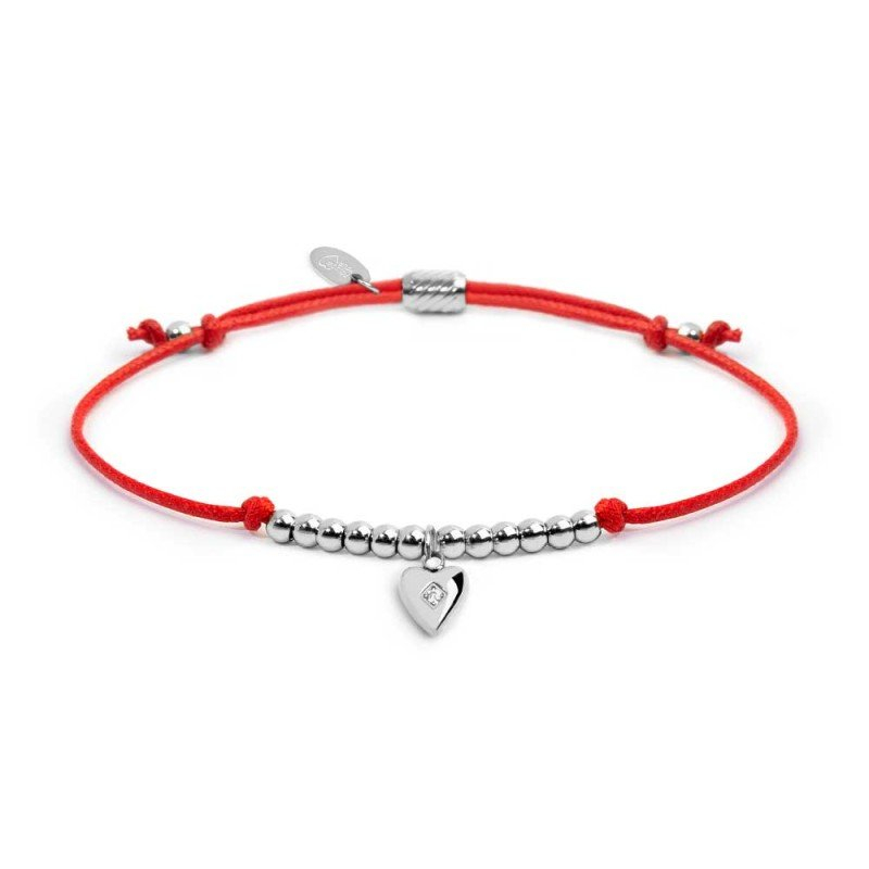 Schwarzes Kordelarmband mit zentralen Kugeln und einem herzförmigen Anhänger aus Stahl oder goldfarbenem PVD-beschichtetem Stahl mit weißem Zirkonia. Verstellbar mit zwei Schiebeknoten bis zu einem Durchmesser von 8 cm. Ovales Schild mit dem eingravierten Marlù-Logo auf der einen Seite und dem Schriftzug „FOLLOW YOUR“ sowie einem Herz auf der anderen. Referenz: 18BR216-N