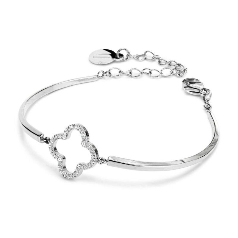Boccadamo Damenarmband aus der Mya Piccole Gioie Kollektion. Halbstarres Stahlarmband mit einem vierblättrigen Kleeblatt, besetzt mit weißen Zirkonia-Steinen. Verstellbare Armbandlänge von 17,5 bis 20,5 cm. Karabinerverschluss. Artikelnummer: PG_BR22