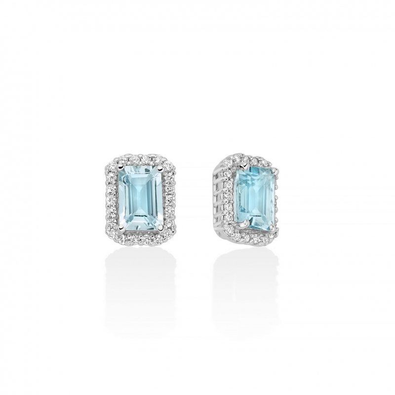 Miluna Damenohrringe aus 750/00 Weißgold (18 kt). Ohrringe mit 2 Aquamarinen im Achtkantschliff von 6x4 mm, insgesamt 1,06 Karat; 44 natürliche Diamanten, 17,6 Gesamtpunkte, Farbe G. Die Ohrringe werden mit einer Schmetterlingsschraube befestigt. Referenz: ERD2842