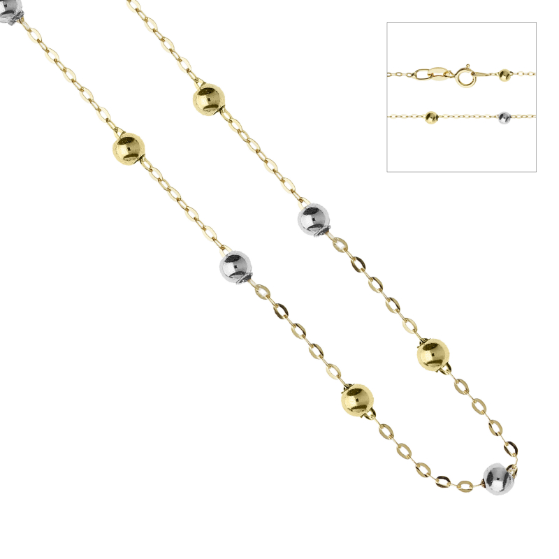Unisex-Halskette aus 18-karätigem Weiß- und Gelbgold. Die Kette ist mit polierten Kugeln (0,25 cm Durchmesser) und einem Karabinerverschluss versehen. Die Länge beträgt 45 cm. Das Gewicht beträgt 1,60 Gramm. Referenznummer: GL101984