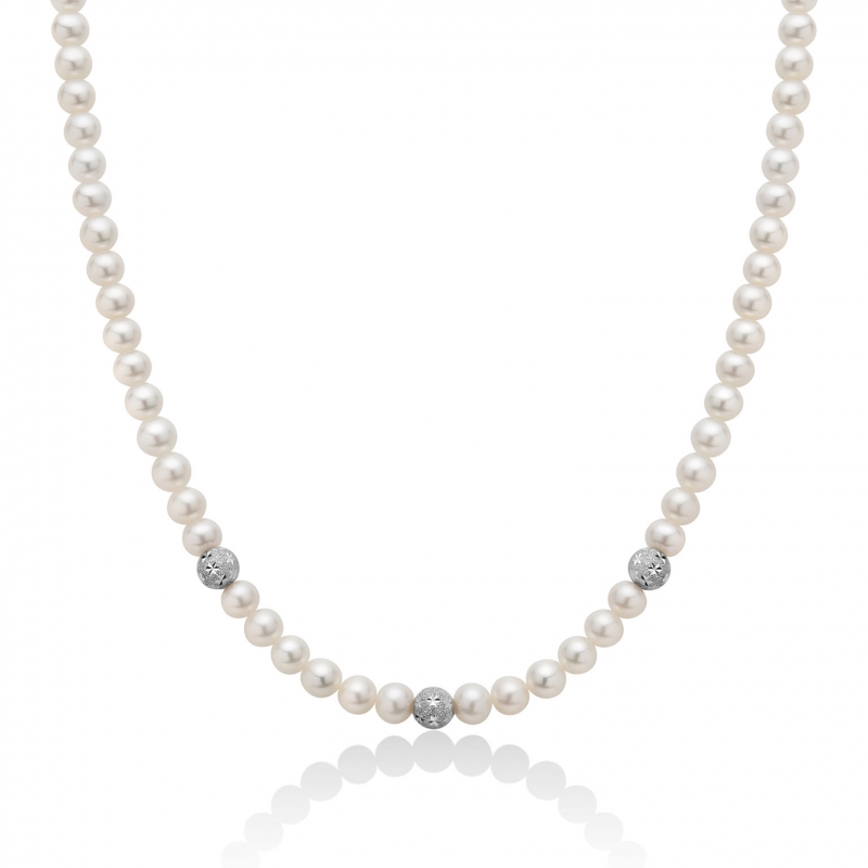 Miluna Damenhalskette aus der Le Perle-Kollektion. Perlenkette Durchmesser 5,5/6 mm mit 3 Kugeln aus 750er Weißgold (18 KT). Geschlossen wird die Halskette mit einem Karabinerverschluss aus 750er Weißgold (18 KT). Die Länge der Halskette beträgt 45 cm. Referenz: PCL5534V