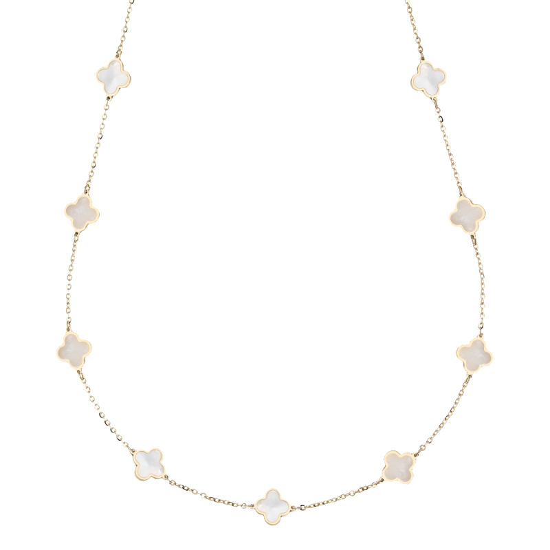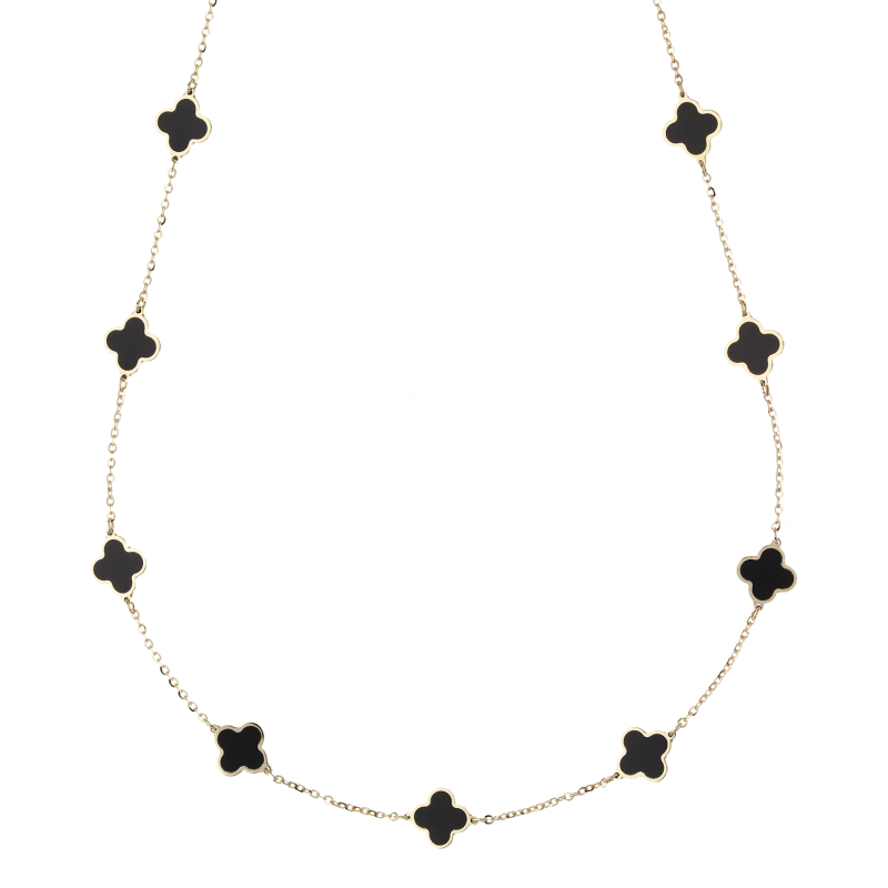 Ein edles Schmuckstück , das Glück und Eleganz vereint. Diese Damenkette aus 18-karätigem Gelbgold , verziert mit zarten vierblättrigen Kleeblättern aus Malachit , strahlt bei jeder Bewegung Licht und Harmonie aus. Ein kostbares Detail , das einen Hauch von Magie und zeitlosen Stil verkörpert.