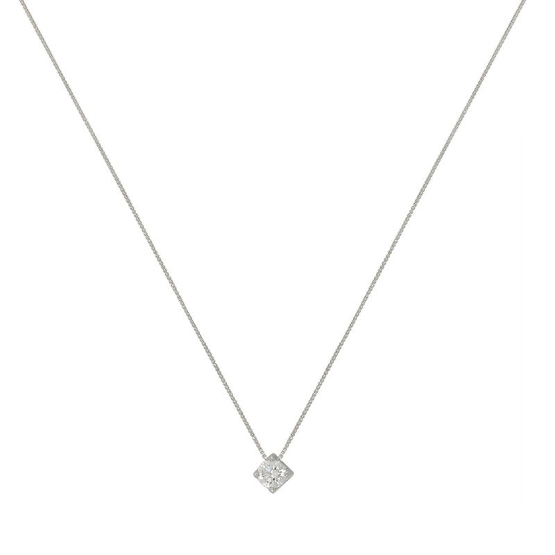 Damenkette aus 18-karätigem (750) Weißgold. Anhänger mit einem weißen Zirkonia. Die Kette ist 45 cm lang und hat einen Karabinerverschluss. Sie wiegt 1,50 Gramm. Referenznummer: GL102331