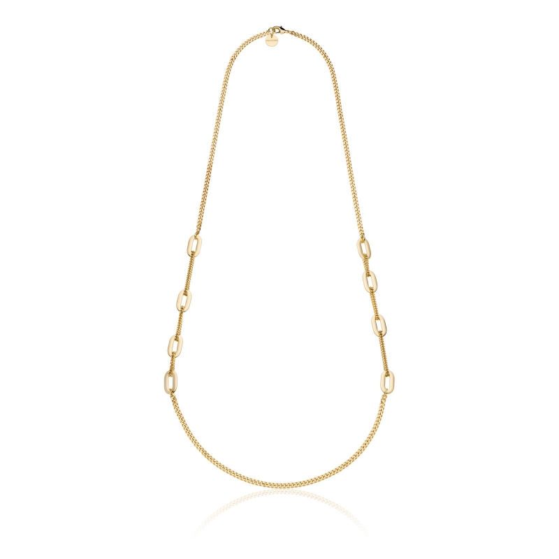 Damenhalskette von Unoaerre Fashion Jewellery aus der Classica-Kollektion. Chanel-Halskette aus Gold-PVD-Bronze mit flachen ovalen Gliedern, die sich mit einer Panzerkette abwechseln. Die Länge der Halskette beträgt 93 cm. Der Verschluss erfolgt mit einem Karabinerverschluss. Referenz: 2376