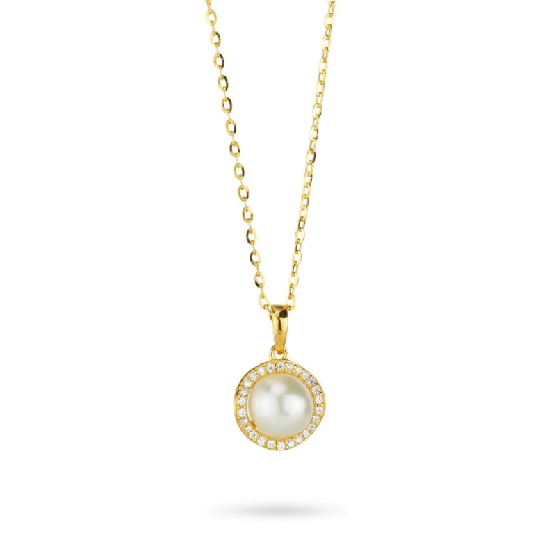 Boccadamo Damenkette aus der Sophie Kollektion. Halskette aus 925er Silber PVD-Gold mit Zirkoniasteinen und Perlenanhänger, verstellbare Länge von 39 bis 43,5 cm. Karabinerverschluss. Referenz: GR926D