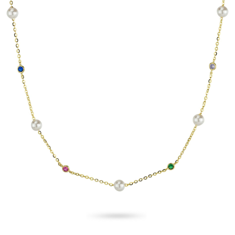 Boccadamo Damenhalskette aus der Sophie-Kollektion. Halskette aus 925er Silber mit PVD-Goldbeschichtung und Perlen im Wechsel mit farbigen Kristallen, verstellbare Länge von 40,5 bis 42,5 cm. Karabinerverschluss. Referenz: GR934D