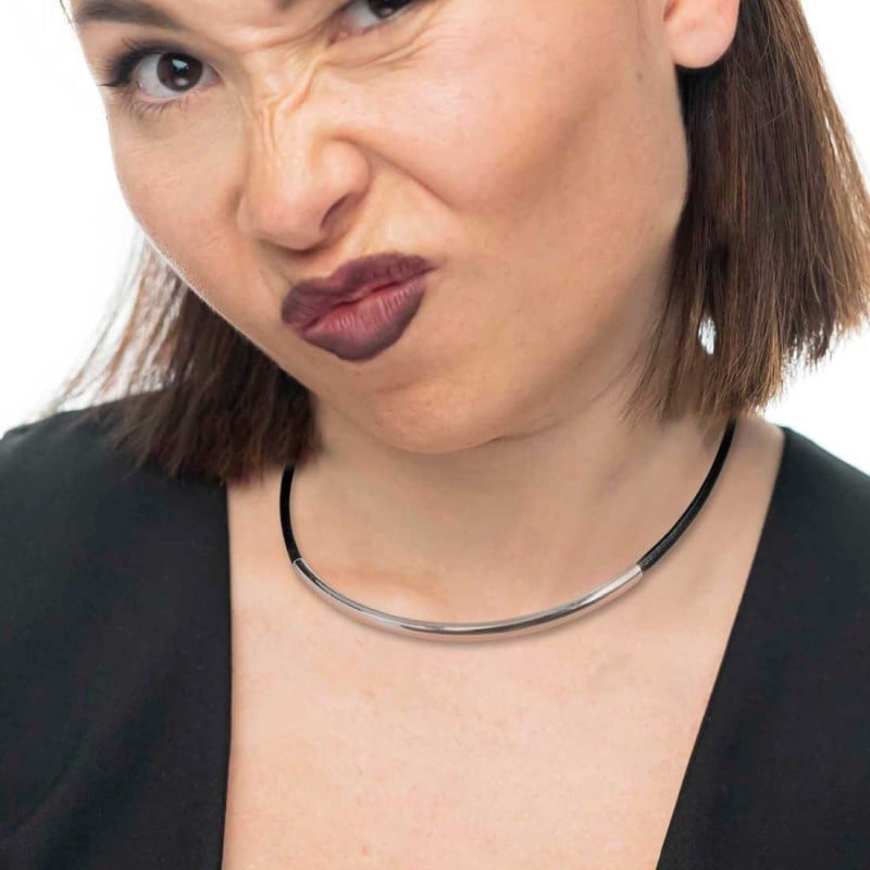 Halskette aus schwarzer Wachskordel mit rundem Mittelstück aus Stahlrohr. Gesamtlänge: 42 cm, verstellbar von 42 cm bis 32 cm mit einem Schieber. Referenz: 33CN0043-N