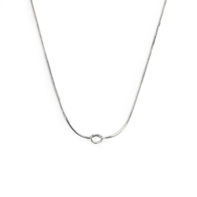 Halskette aus Stahl mit einem achteckigen Schlangenkettenknoten. Ein ovales Plättchen mit beidseitig lasergraviertem Schriftzug „Knoted“. Gesamtlänge: 44 cm, verstellbar von 36 cm bis 44 cm (Schiebeverschluss). Referenz: 25CN0001N