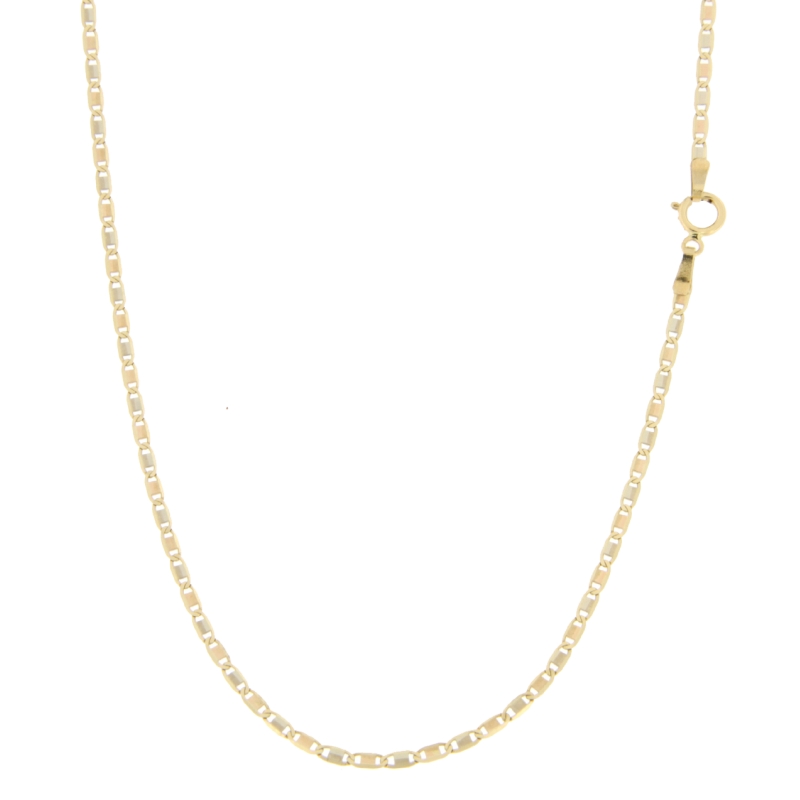 Herrenhalskette aus 750/00 (18 kt) Gelb- und Weißgold. Das Glied der Halskette ist eine Vollkette. Die Länge der Kette beträgt 50 cm. Die Breite des Shirts beträgt 0,20 cm. Der Verschluss der Halskette ist mit Karabiner. Das Gewicht der Halskette beträgt 2,20 Gramm. Referenz: GL100393