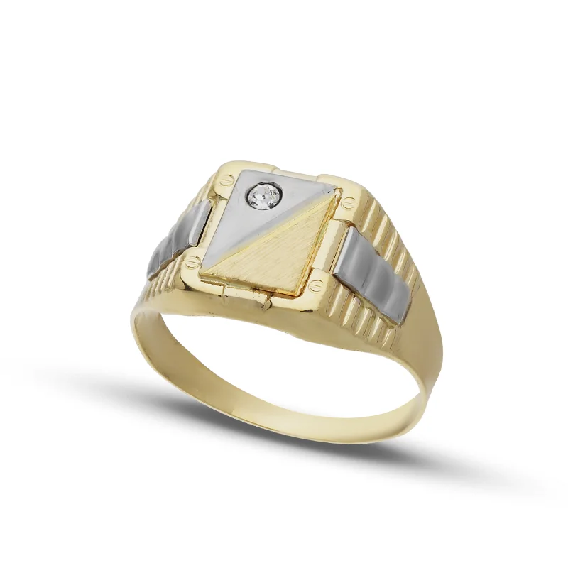 Herrenring aus 750er (18 Karat) Weiß- und Gelbgold. Schildring mit weißem Zirkonia-Stein. Der Ring wiegt 3,90 Gramm. Referenz: GL102116