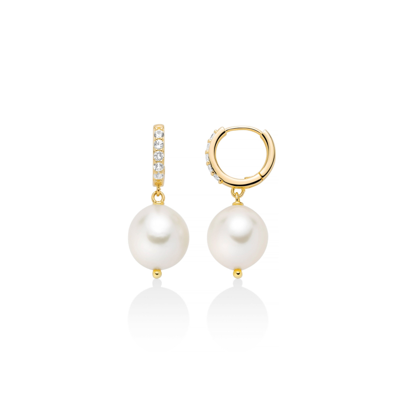 Miluna Damenohrringe aus der Giochi di Perle-Kollektion. Ohrringe aus 925er Gold-PVD-Silber mit 2 echten weißen Barockperlen Durchmesser 12/14 mm und weißem Topas. Länge 3 cm. Referenz: PER2740G