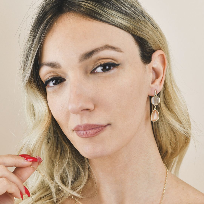 Boccadamo Damenohrringe aus der Crisette-Kollektion. Gold-PVD-Bronze-Ohrringe mit weißen und orangefarbenen Kristallen, Länge 4 cm. Referenz: XOR728DO
