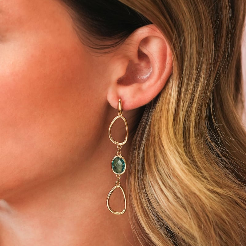 Boccadamo Damenohrringe aus der Crisette-Kollektion. Tropfenohrringe aus vergoldeter Bronze mit grünen Kristallen, 7 cm lang. Referenz: XOR764D