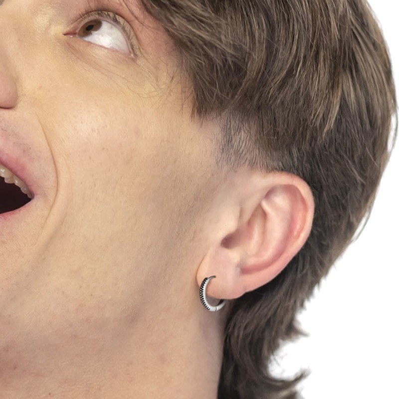 Einzelner Creolen-Ohrring aus Stahl, 1,5 cm Durchmesser, mit gepunktetem, mattschwarzem Öl-Finish und Druckknopfverschluss. Referenz: 33OR0131