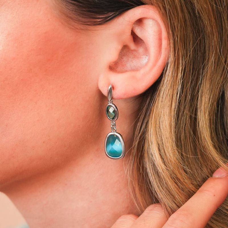 Ohrringe für Damen von Boccadamo aus der Crisette-Kollektion. Bronzefarbene Hängeohrringe mit türkisfarbenen und petrolfarbenen Kristallen, 4 cm lang. Artikelnummer: XOR761A