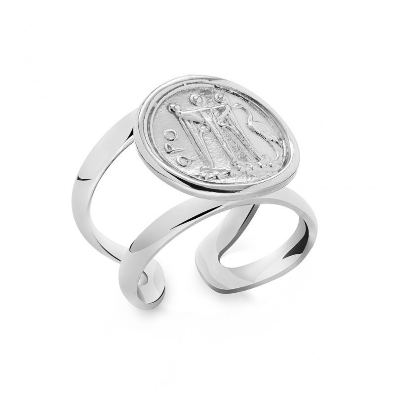 Der im Wachsausschmelzverfahren hergestellte und von Hand bearbeitete Ring zeigt den „Stater“, eine Münze des antiken Kroton aus der Zeit des Großgriechenlandes (510–490 v. Chr.). C. Der Tripod ist im Stater abgebildet, der im antiken Magna Graecia ein dreibeiniger Behälter war, der auf dem Feuer platziert wurde, um Wasser zu erhitzen. Stative wurden als Geschenke an Götter, Gäste und siegreiche Sportler angeboten.