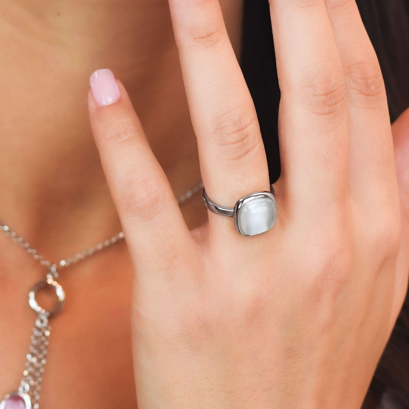 Boccadamo Damenring aus der Crisette-Kollektion. Bronzering mit weißem, facettiertem Kristall, verstellbare Größe von 13 bis 19. Referenz: XAN213W
