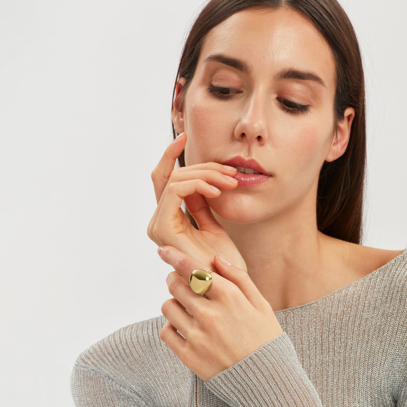 Breil Bubble TJ3838 : Der Bubble-Ring verleiht der Hand eine raffinierte und originelle Eleganz. Die glänzende, goldfarbene Stahlkugel mit ihren weichen, geschwungenen Linien reflektiert das Licht auf zarte Weise und erzeugt so einen fließenden und zeitlosen Effekt.