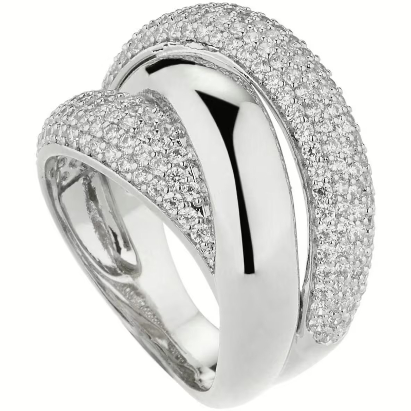 Sovrani Gioielli Damenring aus der Kollektion „Fashion Mood“. Rhodinierter Messingring mit weißen Zirkonia-Steinen. Ringgröße 17. Referenznummer: J9685