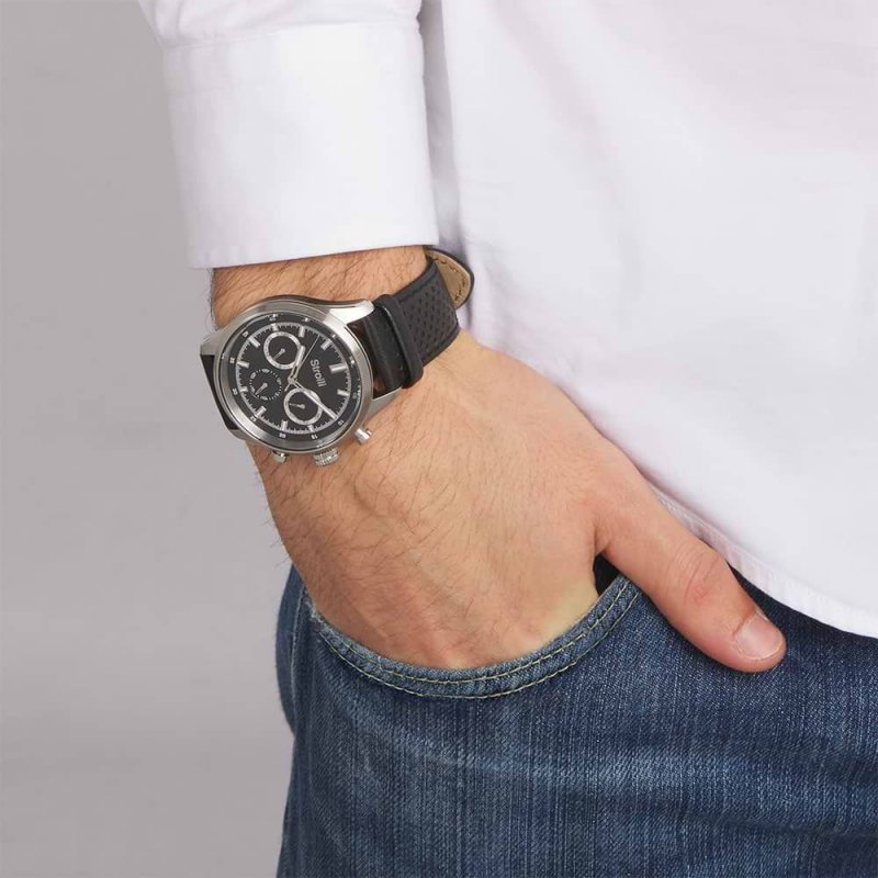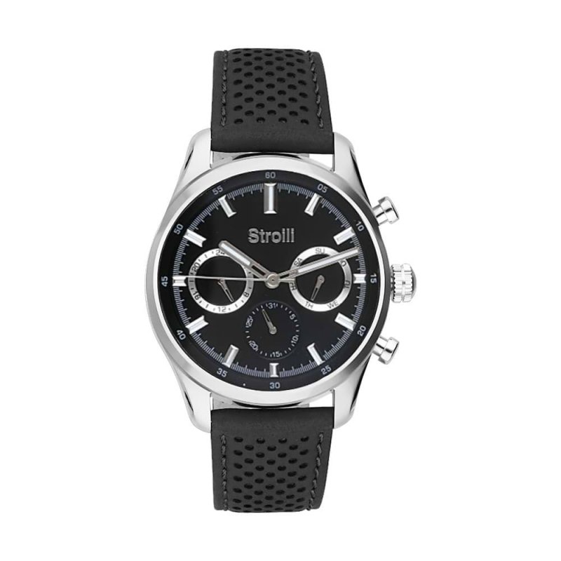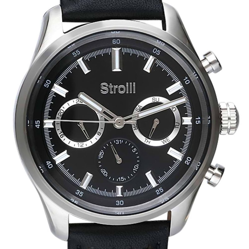 Stroili Herrenuhr aus der Newport Kollektion. Das Uhrwerk der Uhr ist Quarz mit Datumsfunktionen, Wochentagsanzeige, 24-Stunden-Tagesanzeige. Das Uhrengehäuse mit 44 mm Durchmesser ist aus Stahl gefertigt. Das Armband ist aus schwarzem Leder. Das Zifferblatt ist schwarz. Die Wasserdichtigkeit beträgt 10 atm / 100 Meter. Referenz: 1665841