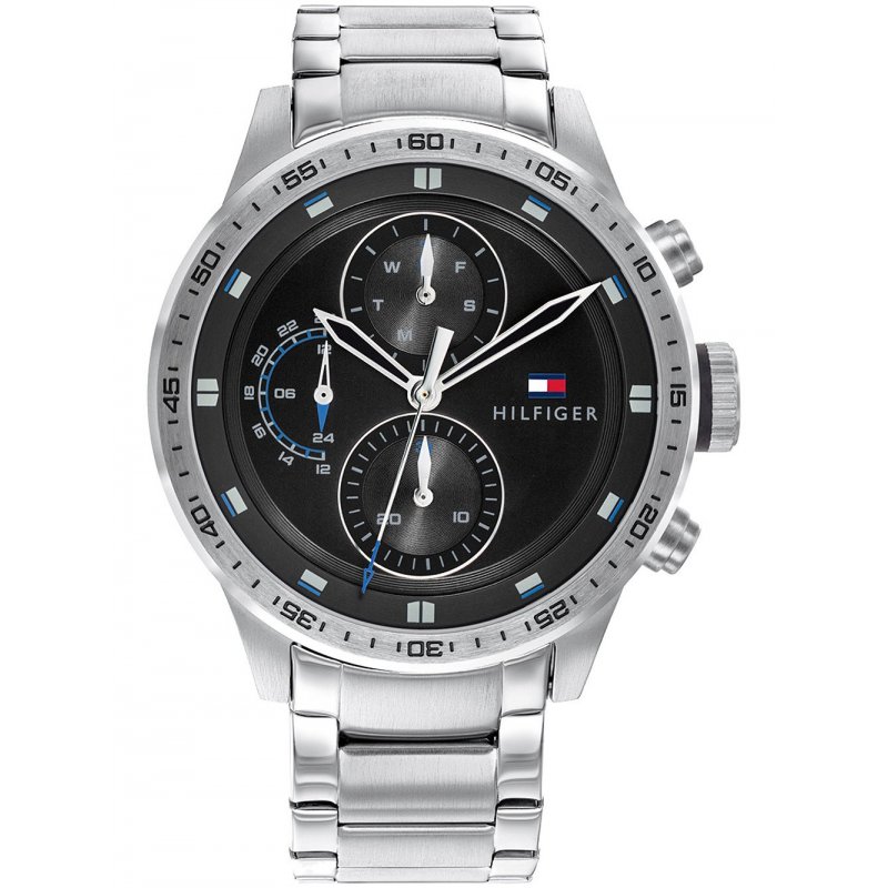 Herrenuhr von Tommy Hilfiger. Quarzwerk mit Datumsfunktionen, 12/24h-Anzeige und Wochentag. Uhr mit 46 mm Gehäuse aus silberfarbenem Stahl. Stahlarmband mit Falt-Drückerverschluss mit Dornschließe , 22 mm breit . Das Zifferblatt ist schwarz. Die Wasserdichtigkeit beträgt 5 ATM / 50 Meter. Referenz: 1791805
