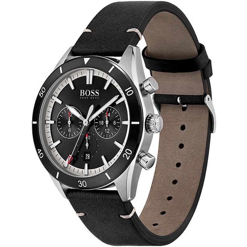 Hugo Boss Herrenuhr aus der Santiago Kollektion. Das Uhrwerk der Uhr ist Quarz mit Datums- und Chronographenfunktionen. Das Uhrengehäuse ist aus Stahl, Durchmesser 44 mm. Das Uhrenarmband ist aus schwarzem Leder. Das Zifferblatt ist schwarz. Die Wasserdichtigkeit beträgt 5 ATM / 50 Meter. Referenz: 1513864