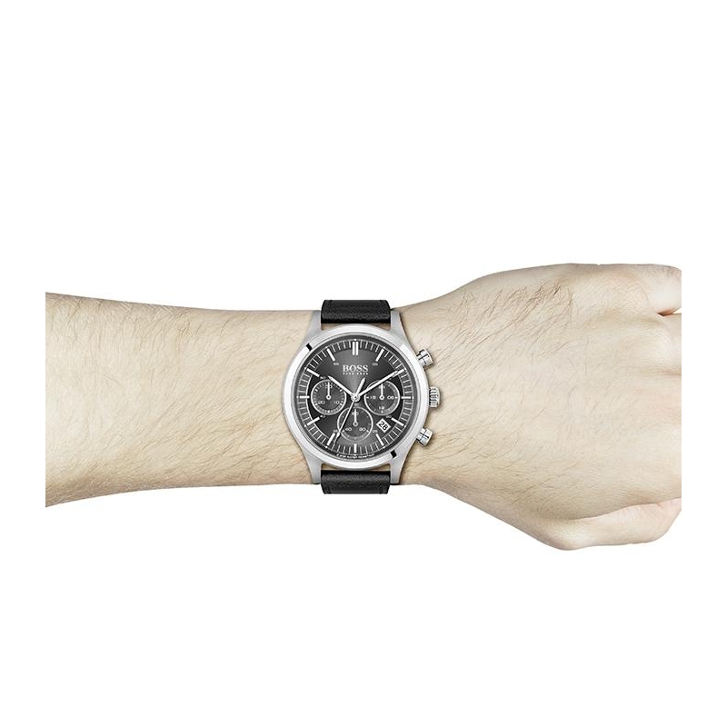 Hugo Boss Herrenuhr aus der Metronome Kollektion. Das Uhrwerk der Uhr ist Quarz mit Datums- und Chronographenfunktionen. Das Uhrengehäuse ist aus Stahl, Durchmesser 44 mm. Das Uhrenarmband ist aus schwarzem Leder. Das Zifferblatt ist grau. Die Wasserdichtigkeit beträgt 5 ATM / 50 Meter. Referenz: 1513799