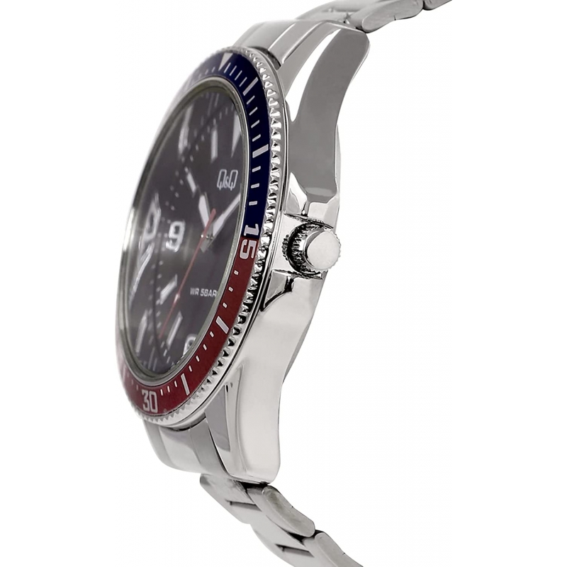 Q&Q Herrenuhr. Das Uhrwerk der Uhr ist Quarz mit Datumsfunktionen. Das Uhrengehäuse ist aus Stahl, Durchmesser 43 mm. Das Armband der Uhr ist aus Stahl. Das Zifferblatt ist schwarz. Die Wasserdichtigkeit beträgt 5 bar / 50 Meter. Referenz: A172J222Y