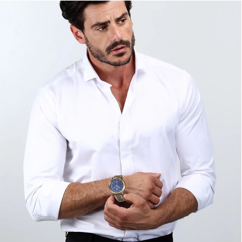 Maserati Herrenuhr aus der Epoca-Kollektion. Das Uhrwerk ist Quarz mit Datumsfunktionen. Das Gehäuse besteht aus goldfarbenem PVD-Stahl mit einem Durchmesser von 42 mm. Das Armband besteht aus goldfarbenem PVD-Stahl. Das Zifferblatt ist blau. Die Wasserdichtigkeit beträgt 10 atm / 100 Meter. Referenz: R8853118027
