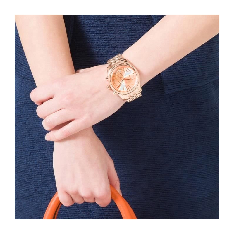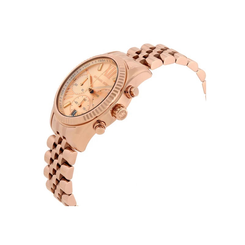 Damenuhr von Michael Kors. Das Uhrwerk ist Quarz mit Datums- und Chronographenfunktion. Das Gehäuse besteht aus roségoldenem PVD-Stahl und hat einen Durchmesser von 38 mm. Das Armband besteht aus roségoldenem PVD-Stahl. Das Zifferblatt ist roségoldfarben. Die Wasserdichtigkeit beträgt 10 ATM / 100 Meter. Referenz: MK5569
